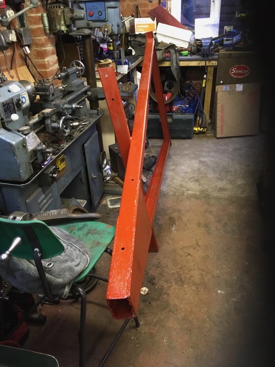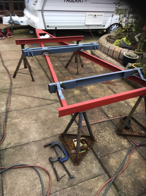 Work is now focussing on repairing the frame. New sections welded in and new plates welded to the front of the A frame to take the new hitch. We wanted a ball hitch rather than an eye. Thoe old hitch was bent anyway. The new crossmembers were positioned and welded in place. The axle and springs are now fitted, next job to connect the brakes, new rods will be needed due to changing the hitch.