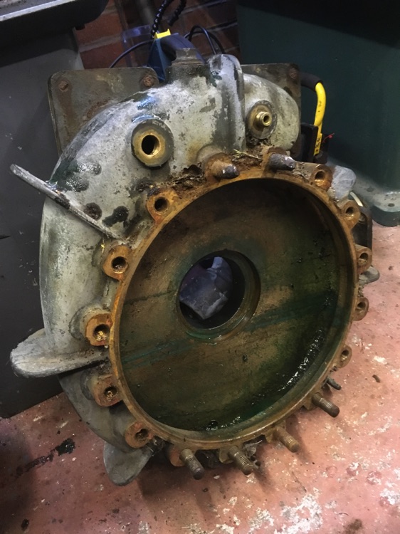 First job was to strip the pump for inspection. As you can see it was badly worn. A plan was formulated and gunmetal obtained to carry out the repairs. The impeller would just fit on my Harrison M300 so machining wasn't going to be a problem.