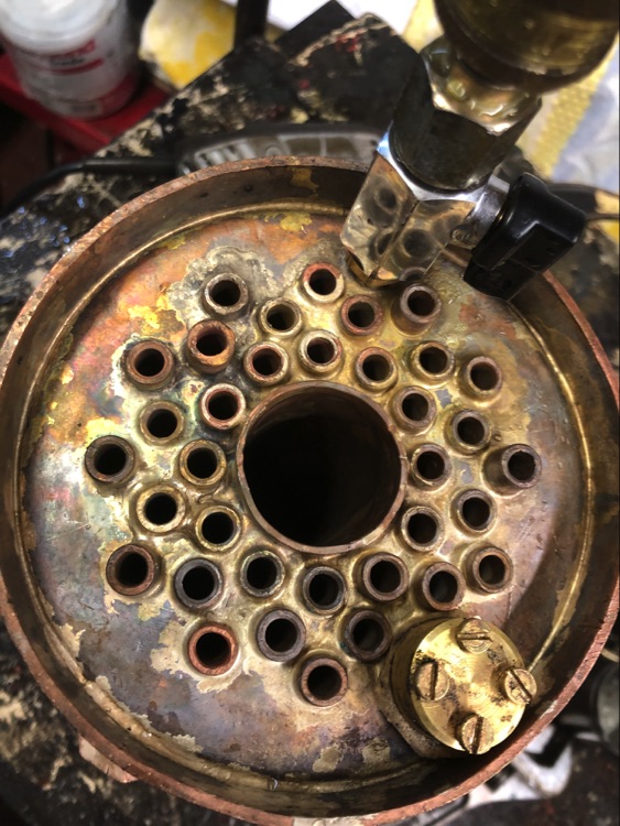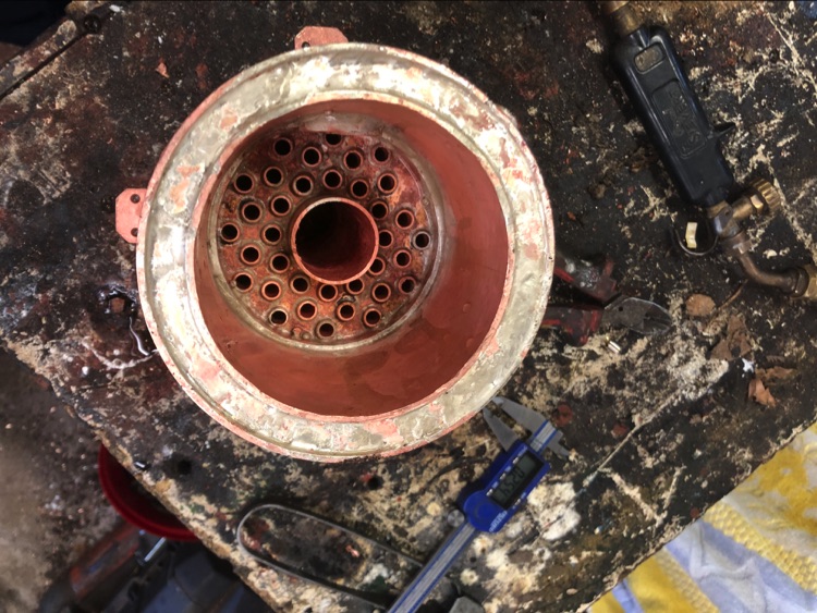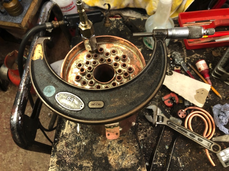 A new boiler needs a shell test, hydraulic testing to 200 psi, which is twice working pressure. I took it up to 50psi and I found a small leak around one of the tubes, I re-flowed the silver solder and retested gradually taking the pressure up to 200psi. I held it there for 20mins. The boiler grew in diameter by 0.04mm.