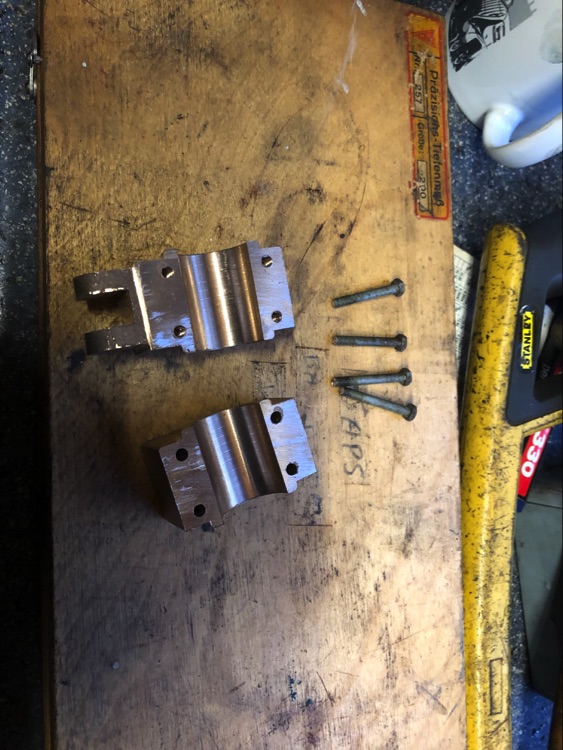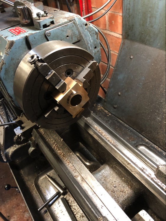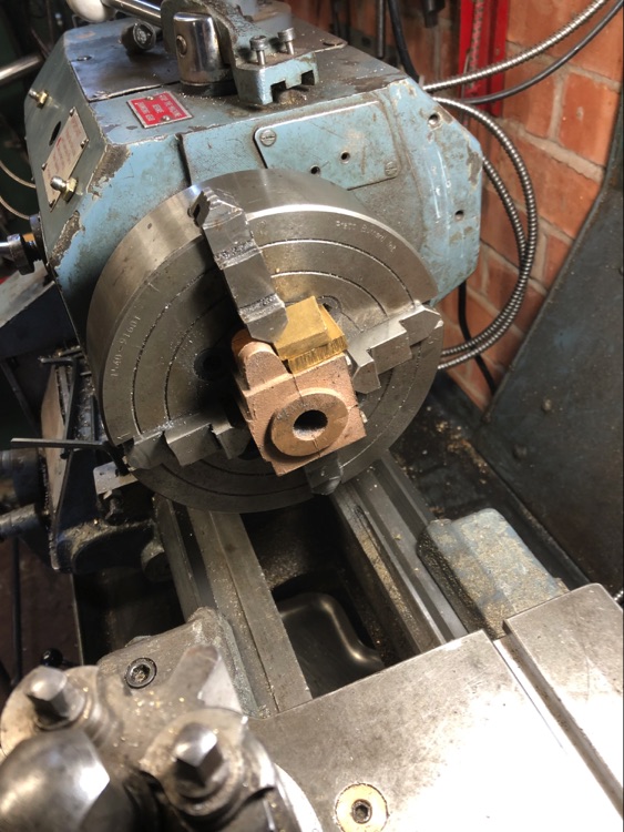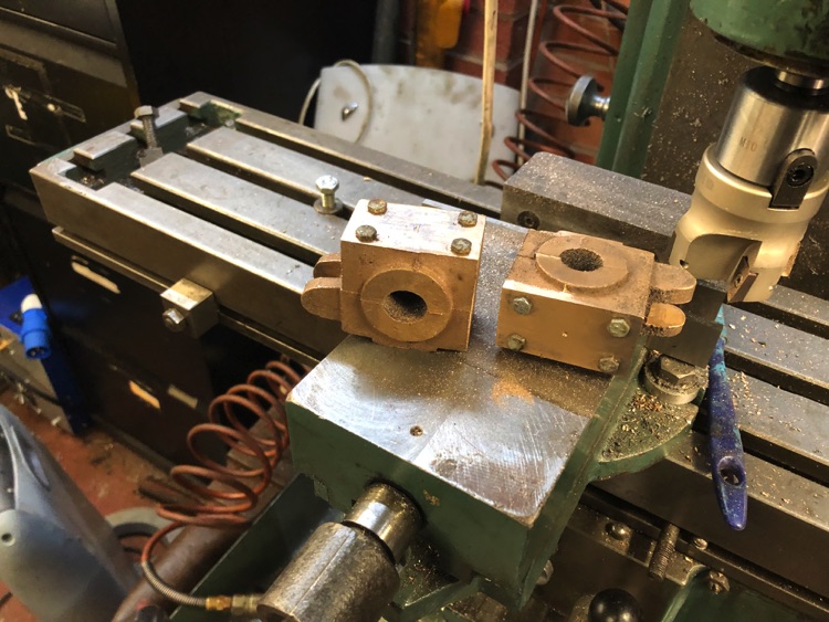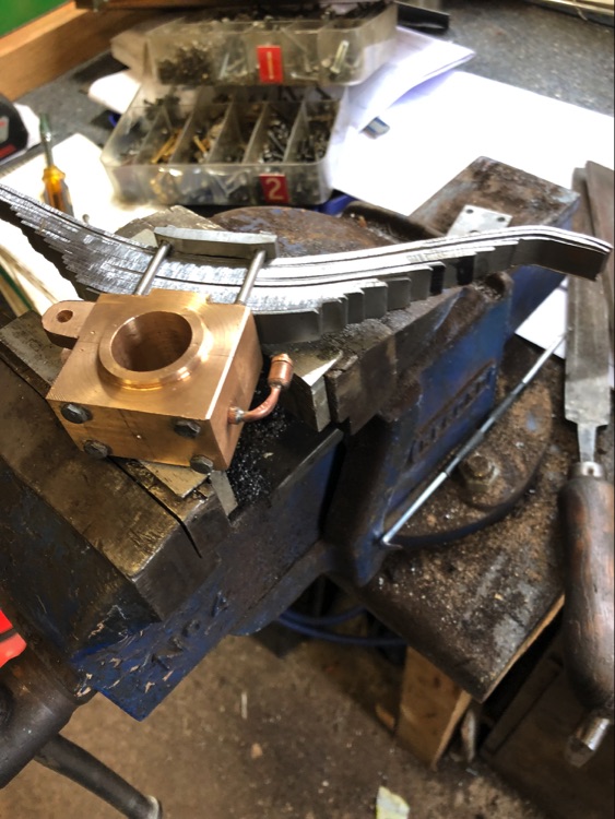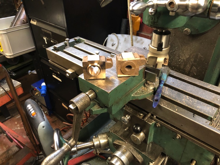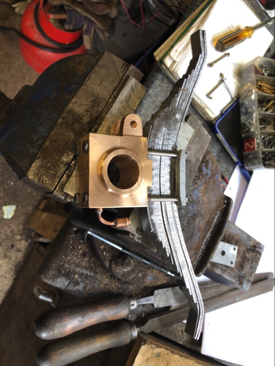 The rear axle bearings are a Gunmetal casting. I machined a flat surface to use as a datum, laid out the 4 holes for the through bolts to hold the two halves together using the DRO. I then split the bearing using a slitting saw, bolted the 2 halves back together and machined them in the lathe boring the hole to size. I then cleaned up the remaining surfaces on the mill, made the oil cups and soft soldered them in place. The holes for securing the 2 halves together pass through the block and a clamp plate for the spring is bolted down into the same tapped holes. As is usual practice there is a centre bolt on the spring and this locates in a hole in the keep plate and bearing block.