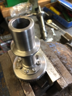 The crown wheels bolt to the flange turned on each part. I first drilled the crown wheels on the Tom Senior using the DRO and then transferred the holes to the flange for drilling and tapping. The short one was easy, but to gain access to the flange on the long one I had to build a set up using an angle plate, V block and a long drill!