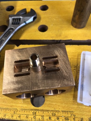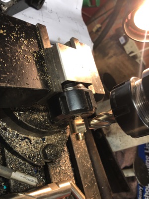 The exhaust stub was next, Just a straight turning job but it needed flats milling on 2 sides to clear the valves. I used a Stevenson collet block to hold the stub and it made it easy to index 180°.
